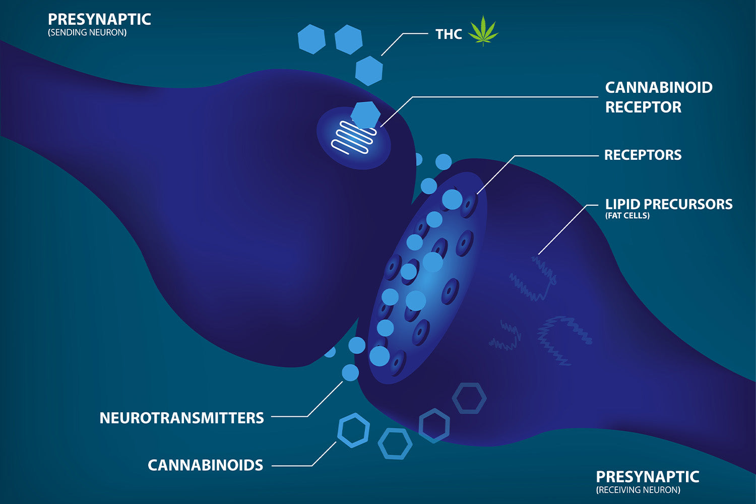 The endocannabinoid system relies on interaction with its cannabinoid receptors to trigger neuron synapses and appropriate responses. There are two types of receptors: CB1 and CB2.