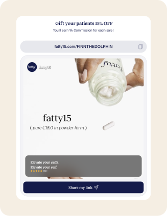 When one of your patients uses your referral code during checkout, you both get rewarded! They receive a discount off their first subscription, you receive a commission for each sale. Share more, save more!